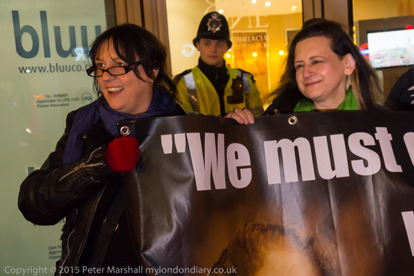Police guard the poor door for the protest - perhaps it is still broken? The lighting has been improved