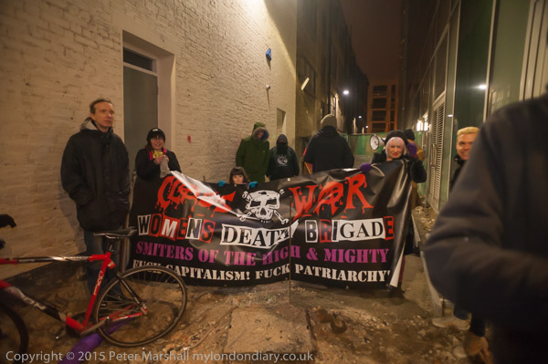 Building work is taking place, and the alley is closed off, but Class War pose in it with the Womens Death Brigade banner