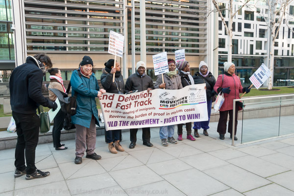 The first group of protesters arrives and poses with the 'End Detention, End Fast track' Movement for Justice banner