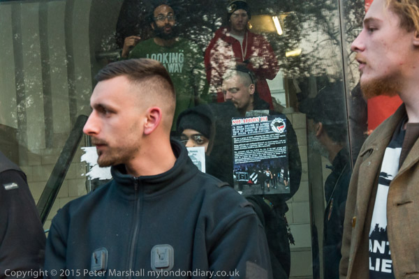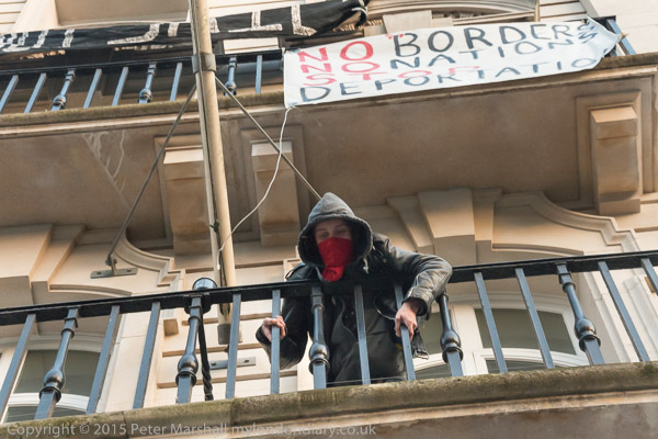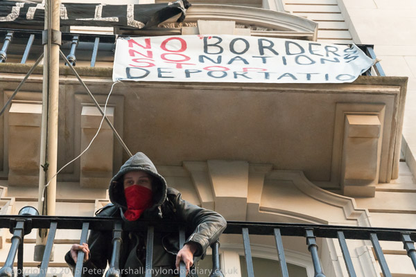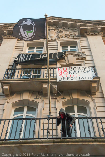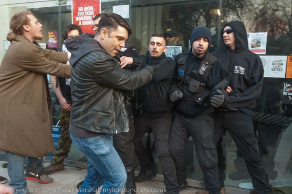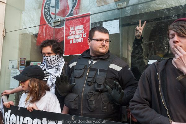 ![]() and the 'No Borders No Nations Stop Deportations' banner ![]() ![]() Security guards act as unlicensed thugs, pushing occupiers and supporters away ![]() ![]() An occupier inside the building makes a 'V' sign ![]() ![]() |