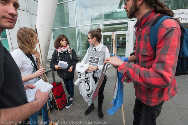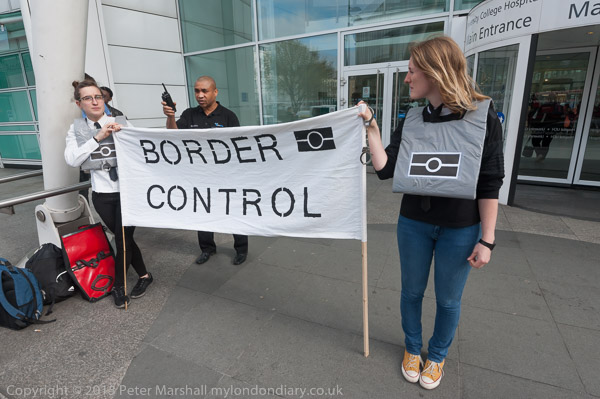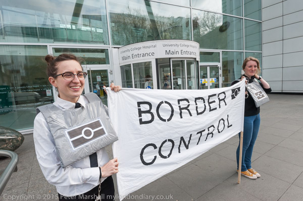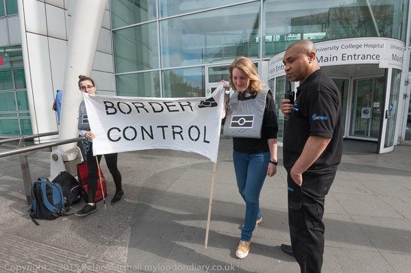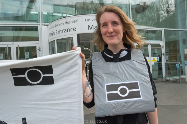Docs Not Cops protesters talk to people outside University College Hospital and hand out flyers as they wait