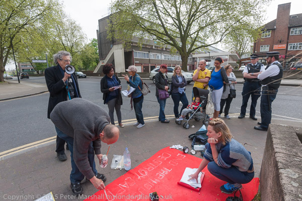 People start making a banner. The police van has gone but a couple of polilce officers remain - and three Estate Wardens