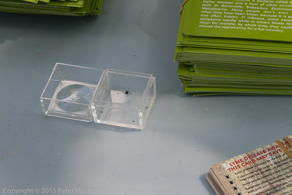 A woman shows me a small plastic box with several dead ticks inside it