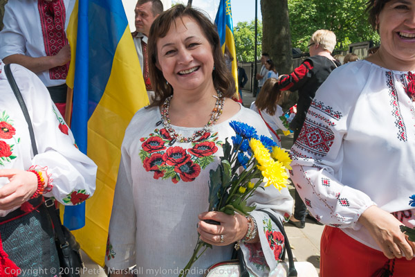 Women wear traditional Ukrainian Vyshyvanka embroidered shirts. Some carried flowers in the blue and yellow of the Ukrainian flag.