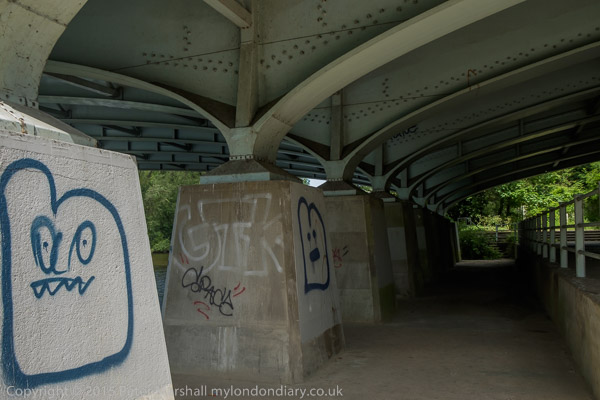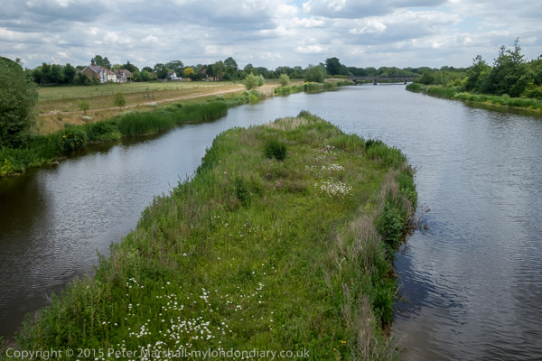 ![]() ![]() And there is a lock at Dorney Reach ![]() ![]() ![]() The Jubilee River, built to divert Thames floods away from Maidenhead and Dorney down to Wraysbury and Staines ![]() Our OS map marked both the Jubilee River and a footpath that used to go across where it now runs. But we didn't swim ![]() We had meant to cross the Jubilee River then come back across this bridge half a mile downstream ![]() A view from the bridge ![]() We walked back along the footpath ![]() to the pub - where the food is rather better than the average pub. |