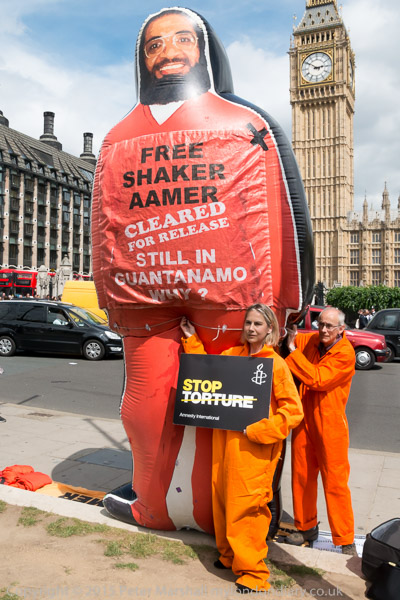 Labour MP for Norwich South, Clive Lewis, stands with Shaker Aamer holding an Amnesty International poster 'Stop Torture'