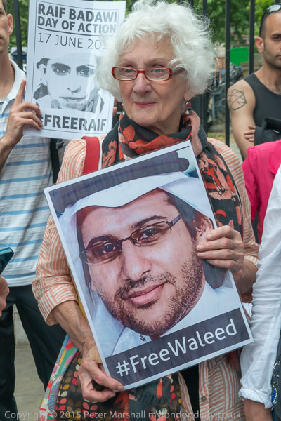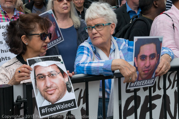 Peter Tatchell and Natalie McGarry MP outside Downing St with letter to David Cameron and picture of jailed blogger Raif Badawi.