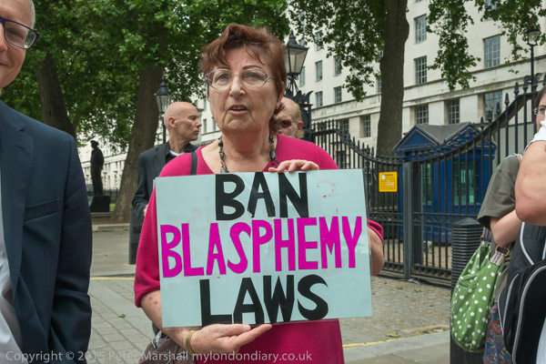 A woman holds a poster 'Ban Blasphemy Laws'