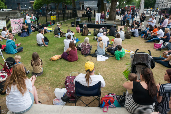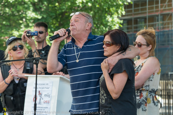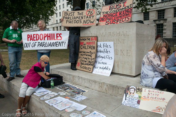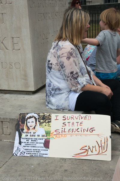 A man speaks at a rally at Downing St calling for an end to the government and police covering up of child abuse.