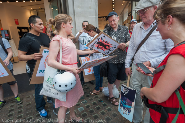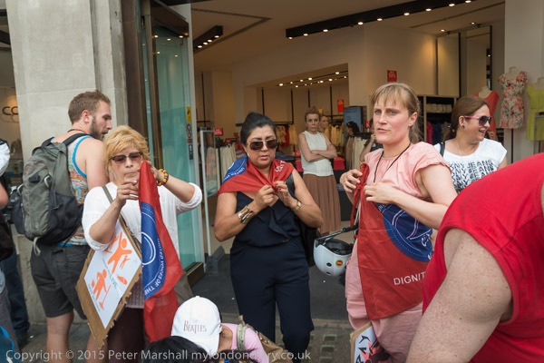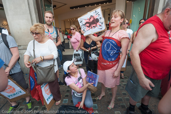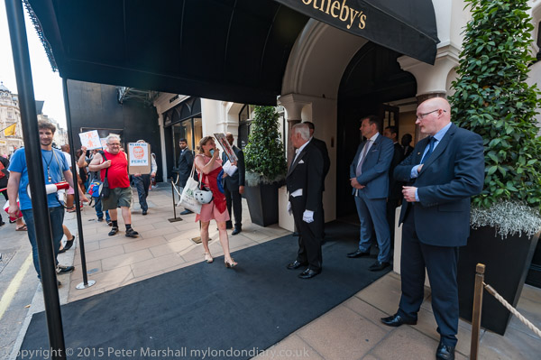 Barbara one of the Sotheby's cleaners kneels and Vera holds up a poster 'Sick Pay Now!'