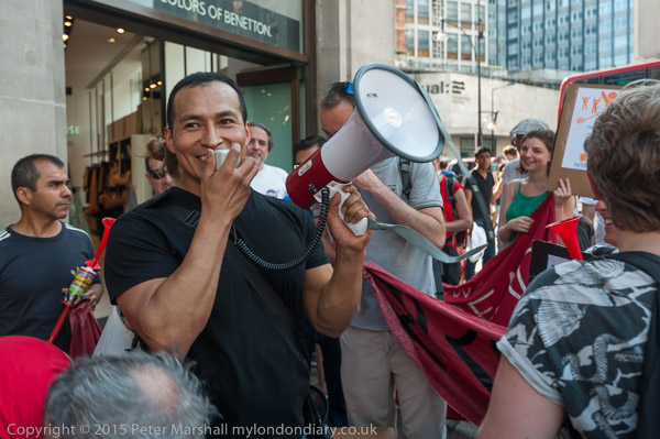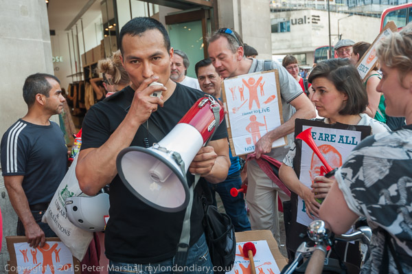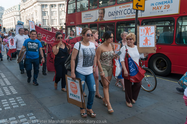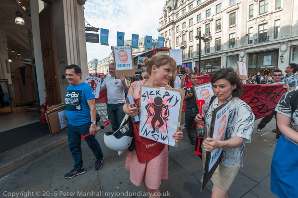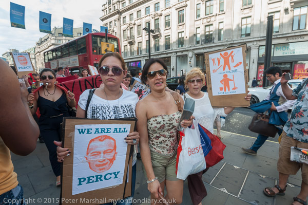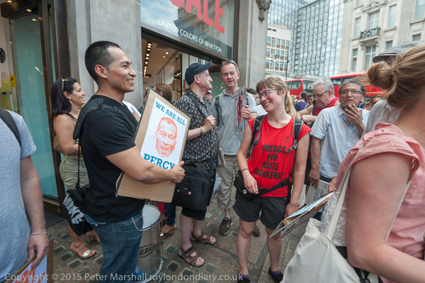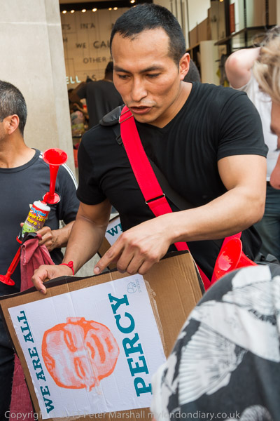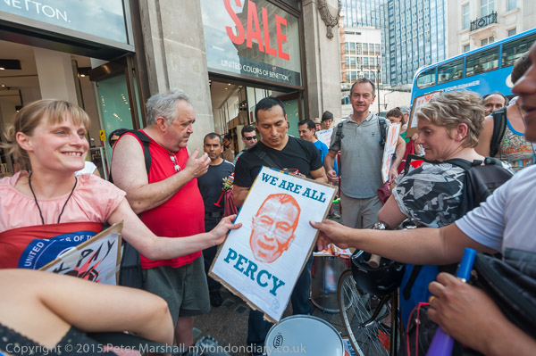 Percy who is being targeted unfairly by Sotheby's because of his trade union activities there holds a placard 'We Are All Percy'
