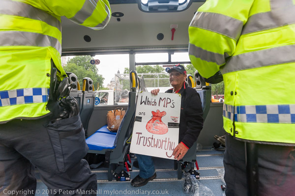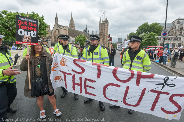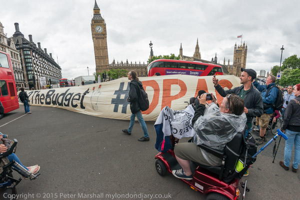 The huge banner stops traffic in front of the Houses of Parliament and down Bridge St