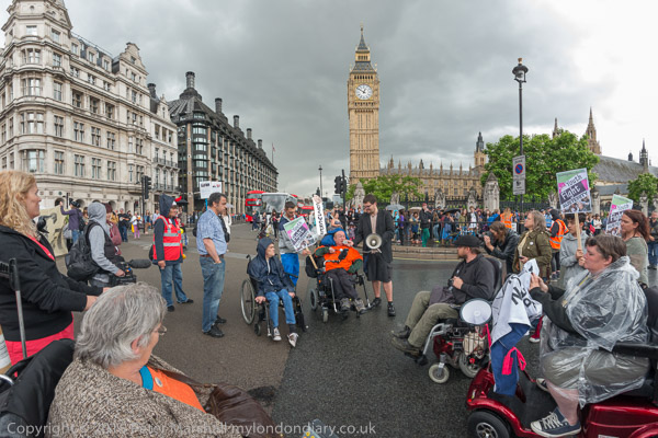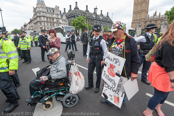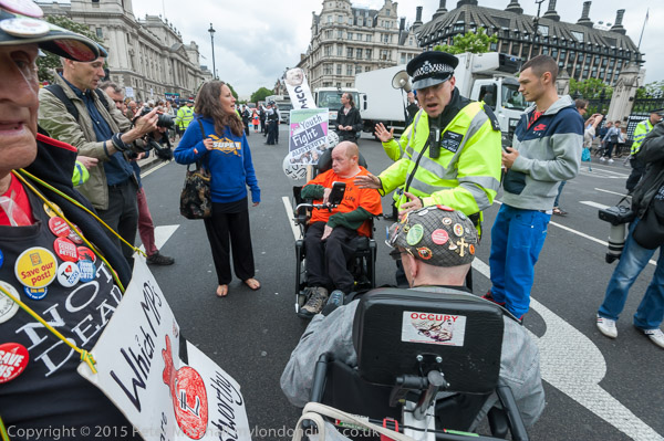 Protesters in wheelchairs are warned they may be arrested if they continue to block the road