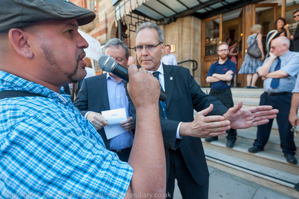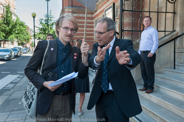 A protester giving out leaflets is asked to move away from the door. But he wants to hand out leaflets to people going in and out