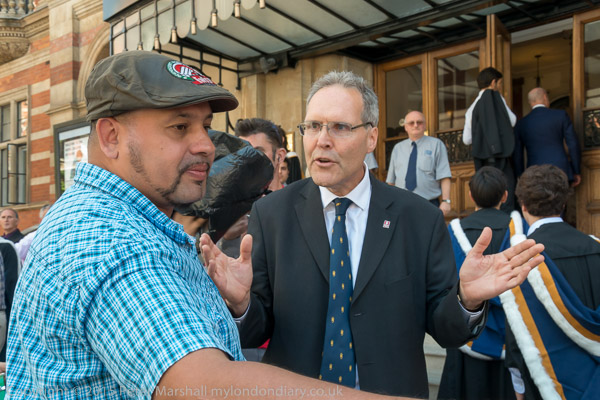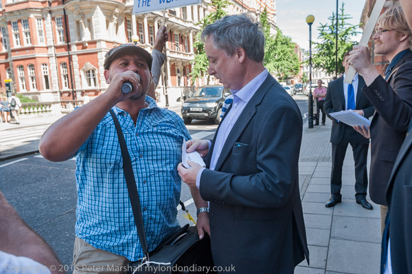 The protesters take no notice of being told to move. They are not obstructing the entrance and have no need to move away