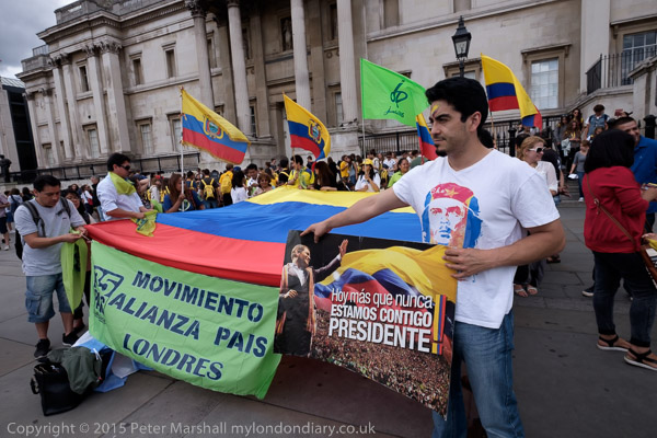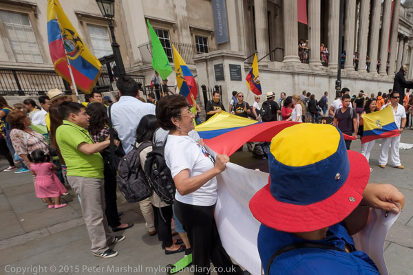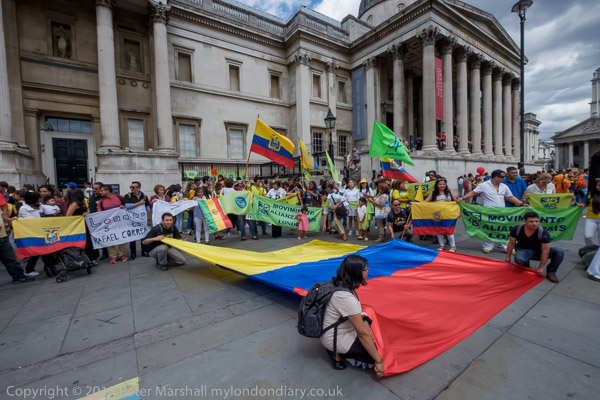 Ecuadorians stretch out a large national flag in front of the National Gallery