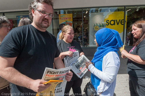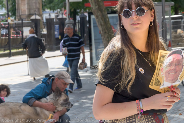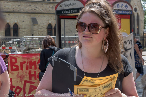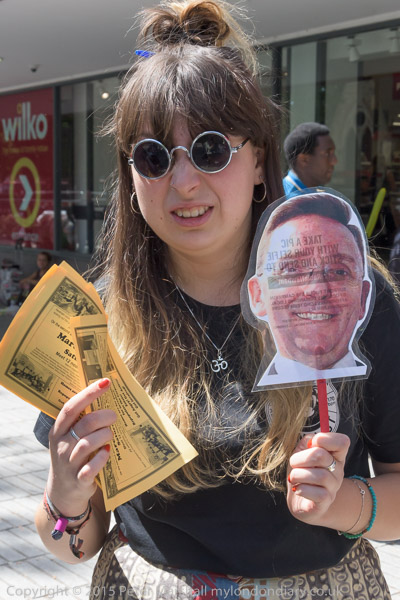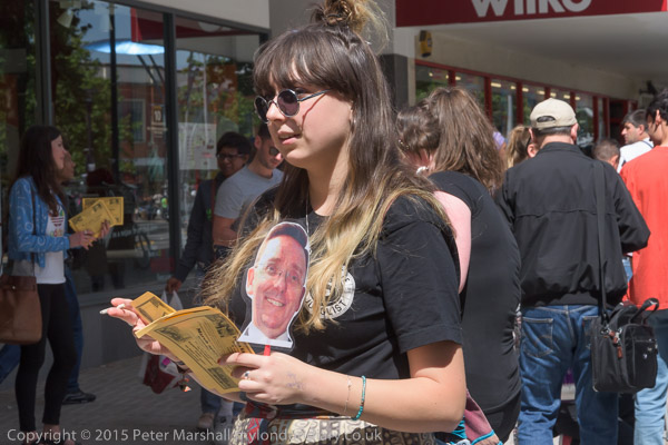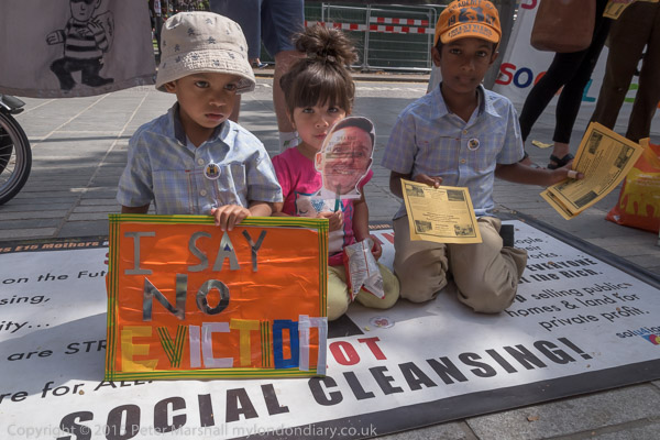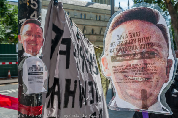 The Robin Wales selfie stick and a young protesters with a sign 'I say No Eviction'