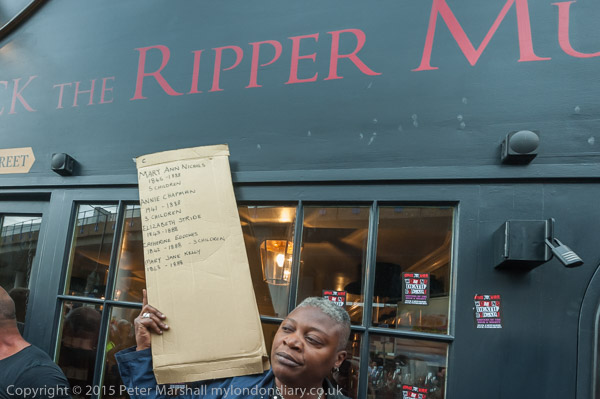A woman holds up the names and dates of birth of some of the women who were the Rippers victims