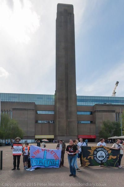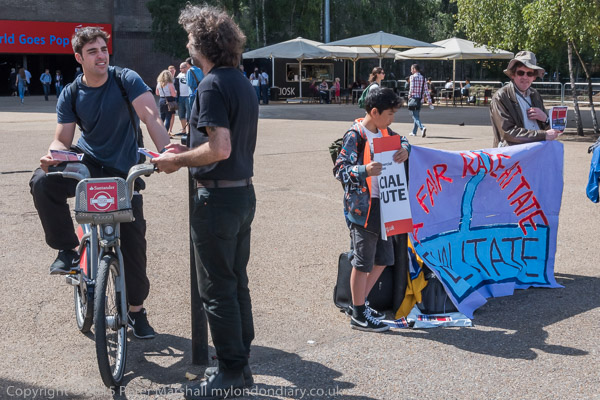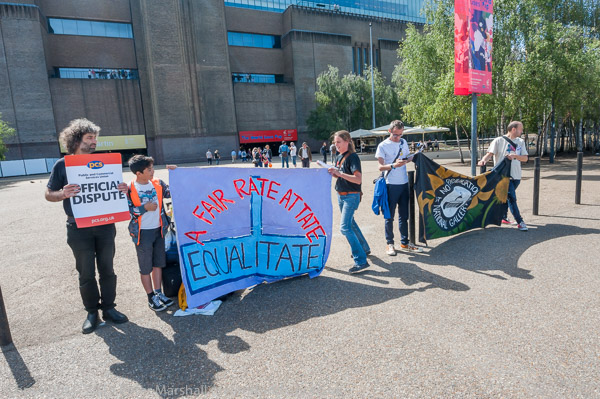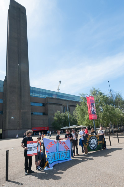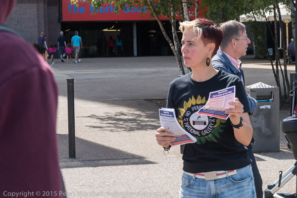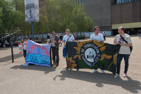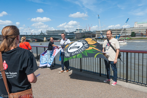 Protesters hold the Equalitate and National Gallery no privatisation banners on the riverside walk
