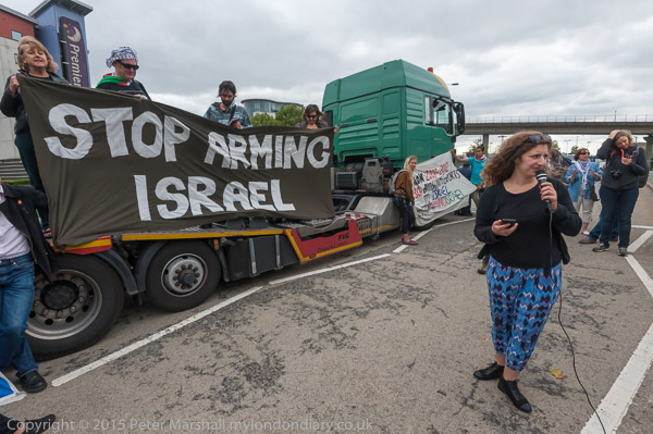 Campaigners stopped a lorry bringing a military vehicle to the DSEi arms fair, blocking the road for several hours in the first of six days of protest against the world's largest arms fair which today had the particular theme 'Stop Arming Israel'.