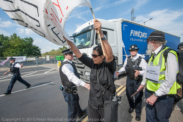 The fence on the roundabout provided a good place to put up a huge banner with the message 'Stop Arming Israel', and when a large low-loader appeared coming up the road carrying a military vehicle, protesters rushed to block the road with smaller banners with the same message. When the vehicle was stopped, one protester wearing an orange jumpsuit and Tony Blair mask locked on to it, and others climbed up onto it, some with one of the banners. Police watched the protesters and sprang into action when one wrote across the front of the military vehicle the message 'Arms tested on children' with a white-board marker, arresting her for 'criminal damage', though the marker would wipe off the paintwork without trace.