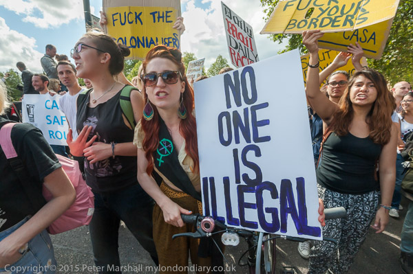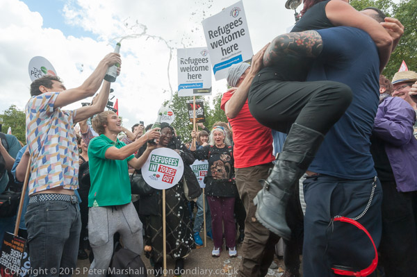 Several hundred anti-Nazi Unite Against Fascism protesters faced just 20 people waving flags in a BNP national demonstration calling for an end to immigration. The UAF made clear that refugees were welcome here. Police kept the two groups apart.