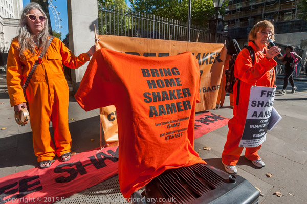 Campaigners at Downing St celebrated that Londoner Shaker Aamer is at long last to be freed from Guantanamo after 14 years of illegal imprisonment and called for him to be immediately brought back and reunited with his family in London.