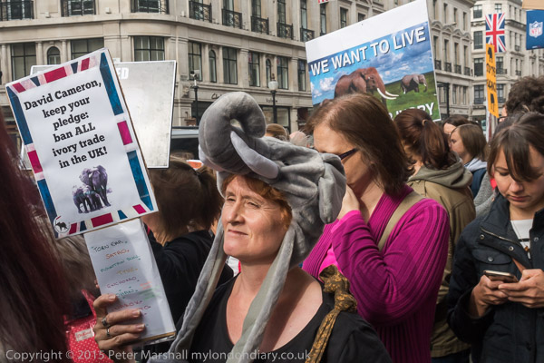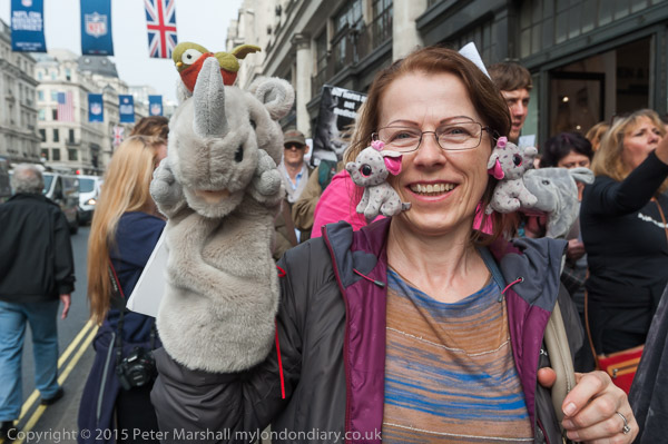 A woman with two elephants on her glasses - I phtoographed her again later on the march