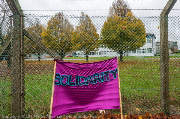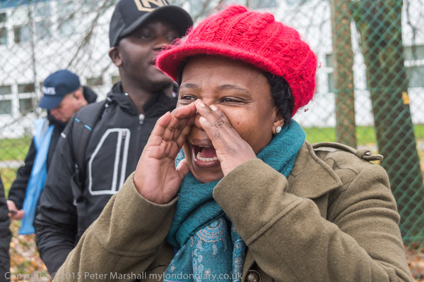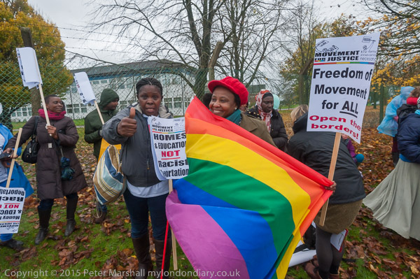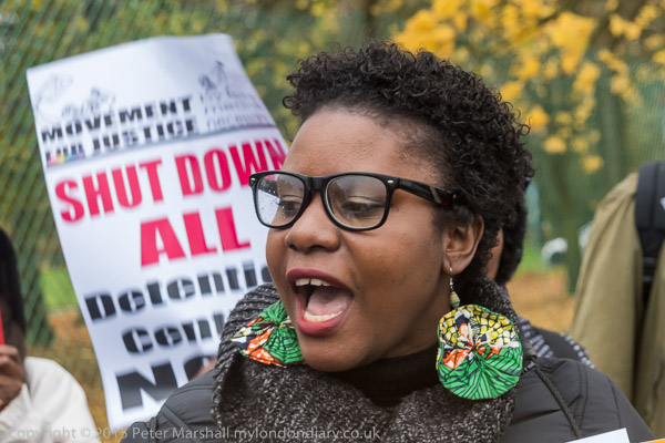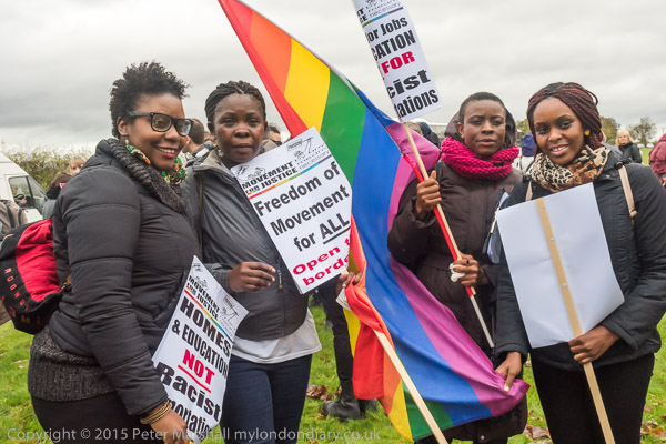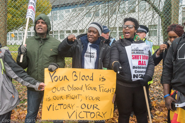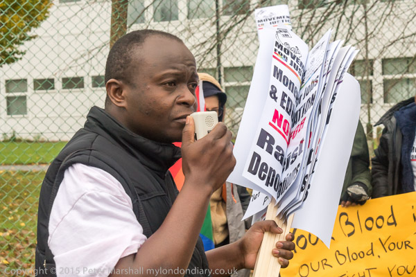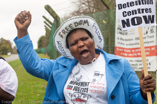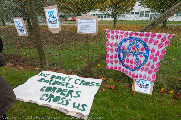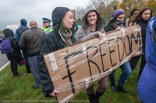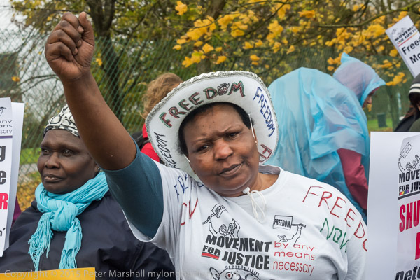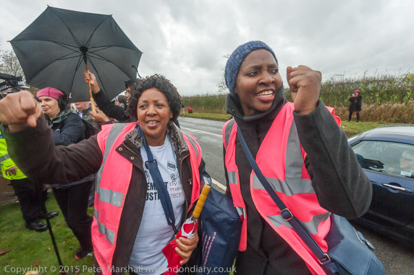 Movement for Justice supporters met on a wide grass verge at the entrance to Twinwoods Business Park