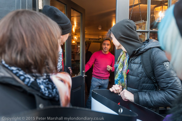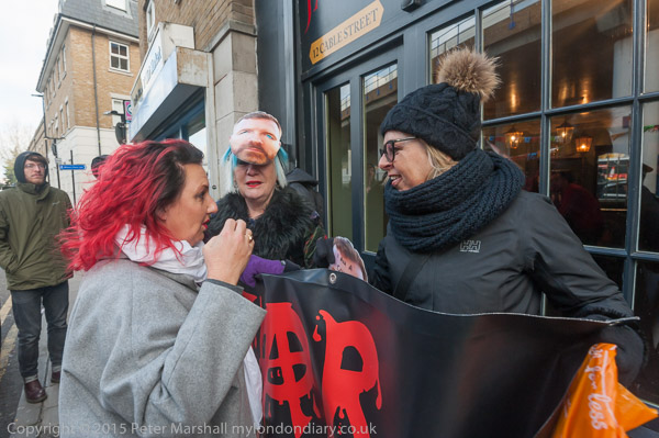 Class War arrive at the Ripper 'museum' with the Womens Death Brigade banner and wearing masks showing