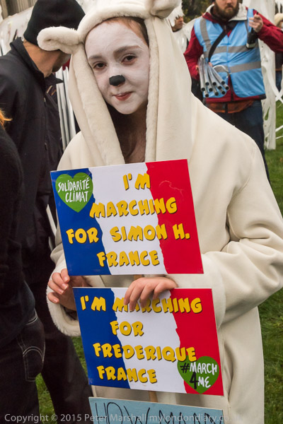 Another polar bear on a protester's head. And a woman marching for two French protesters whose Paris climate march was banned