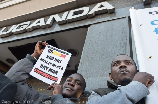 Two other protests were taking place at the Japanese embassy in the short time I was there. As on every Friday, a small group of Japanese and British protesters were handing out leaflets in a protest against the continuing nuclear tragedy at Fukushima, where radiation is still leaking, and I talked to a couple of them before they left to protest outside the offices of TEPCO (Tokyo Electric Power Co ), now moved to a less conspicuous building on Piccadilly. I've photographed these regular Friday protests before (here and here) and didn't on this occasion take more pictures.