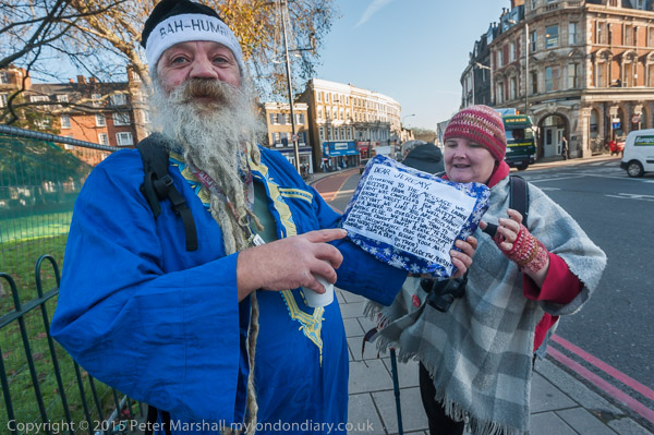 Roy Bard of Mental Health Resistance Network with a present of incontinence pads for Jeremy Swain of Thames Reach Employment Academy,