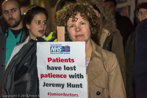Woman with placard in front of Nye Bevan banner at protest in front of now abandoned old Royal London Hospital buildings