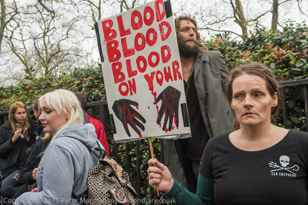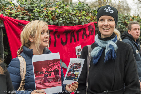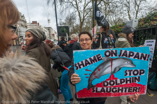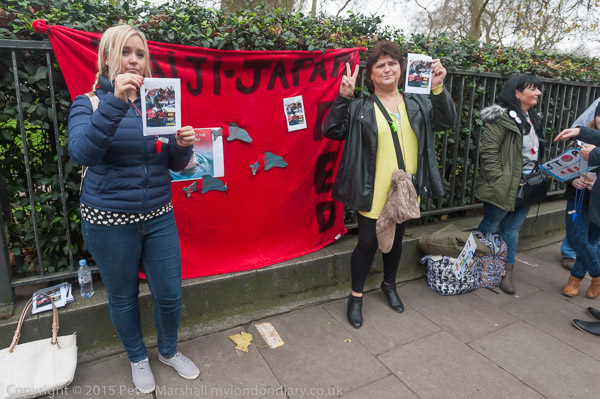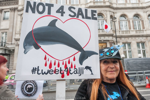 and she holds a placard with a bleeding heart and a dolphin. Behind her the Japanese flag on the embassy cross the road