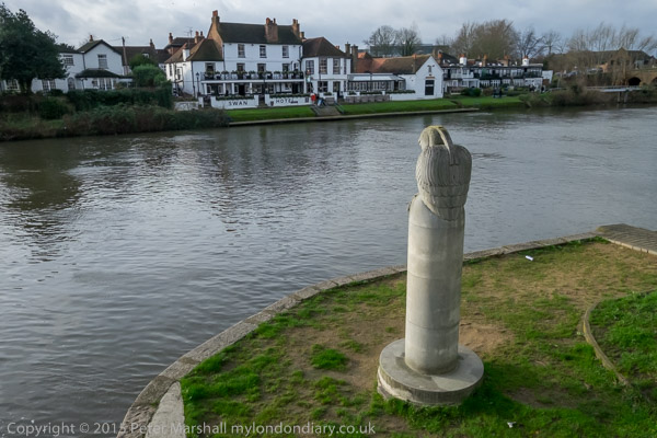 ![]() The Swan Upper in its new location by the Thames is one of the better artworks on the Staines Art Walk ![]() which recently been relaunched. This is The River Guardian looking across at the Swan Hotel ![]() The Swan and The Hythe are both in Egham ![]() The boundary between Staines and Egham runs under the bridge and along the depression here on the Surrey bank ![]() and these buildings are in Staines . I think this dock was designed for use by the Sea Scouts who never really got to use it ![]() a fishy boat on the Thames ![]() and the waterworks at Egham which has a large intake from the River Thames ![]() ![]() There were no 'Fishing Fanatics' on this stretch of the Thames on Boxing Day, but they had left their mark ![]() |