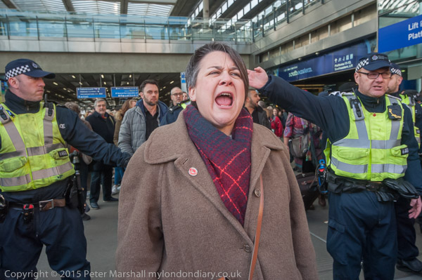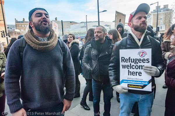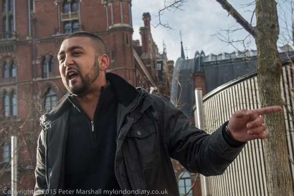 one of the organisers talks briefly about Calais and asks everyone to walk to protest at St Pancras International