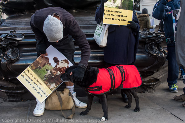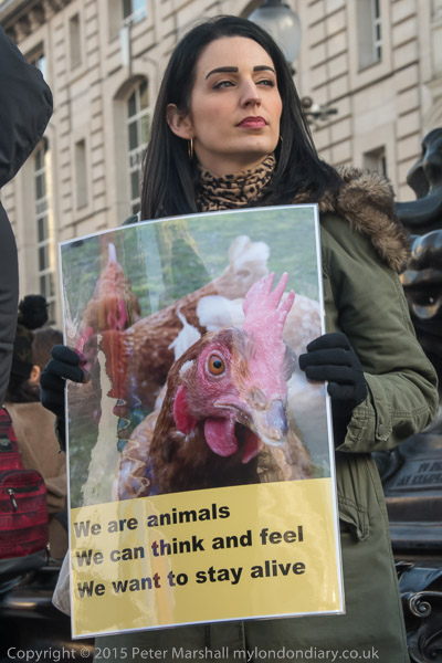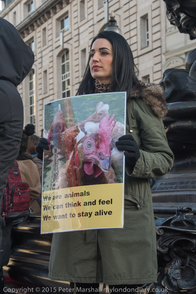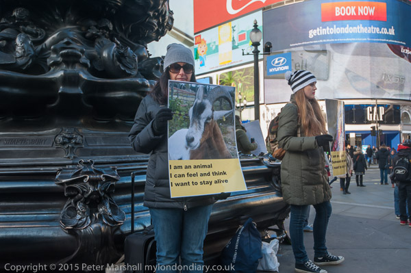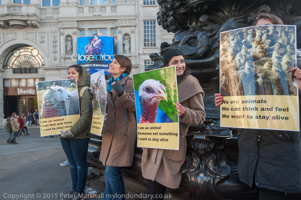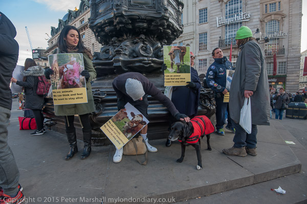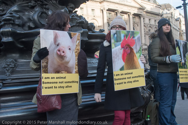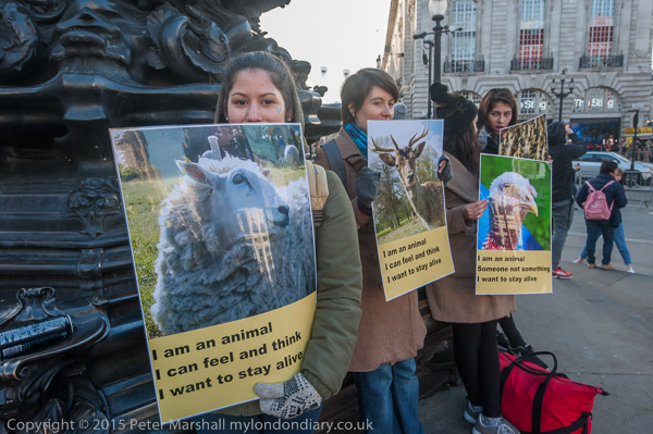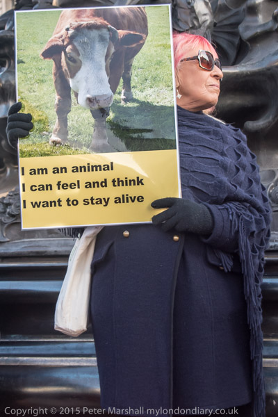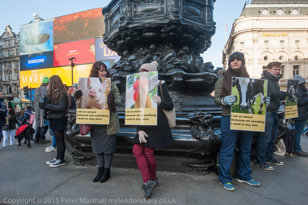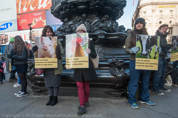 'I am an animal - Someone not something - I want to stay alive' VVegans stand with posters around the base of Eros