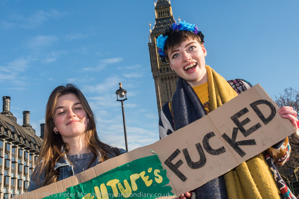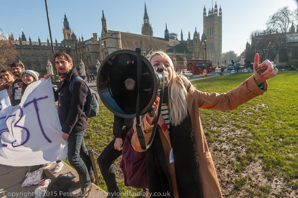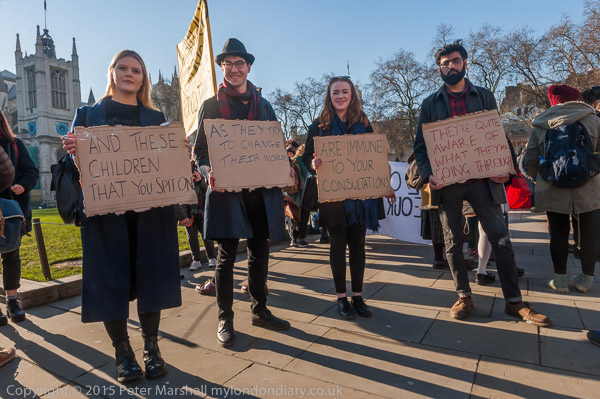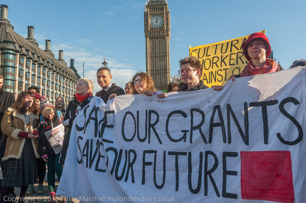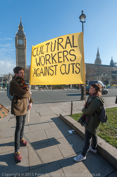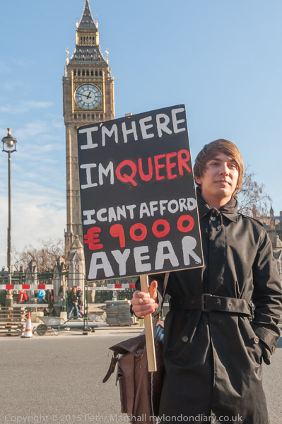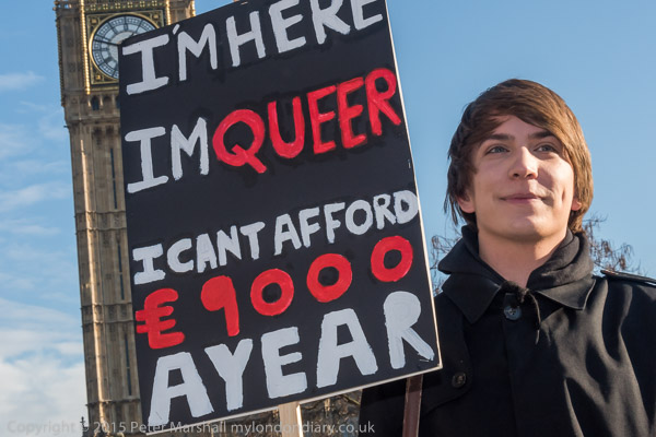 The 'Cultural Workers Against Cuts' banner and a placard 'I'm Here - Im Queer - I cant afford £9000 a year'