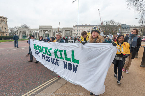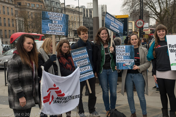 Supporters of Medecins Sans Frontieres at Hyde Park Corner for the march with #SafePassage placards