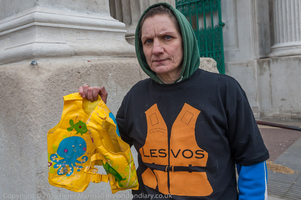 A `No Borders' supporter wears a 'Lesvos' t-shirt and holds up one of the lifejackets brought back from working there
