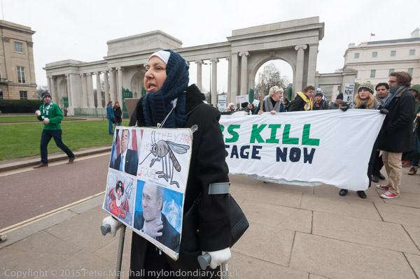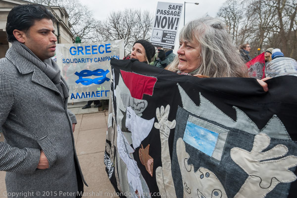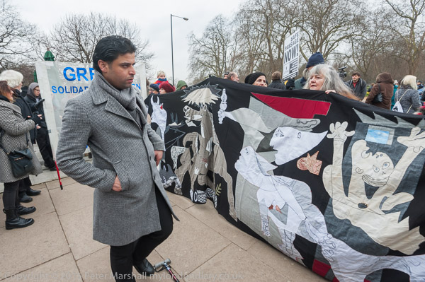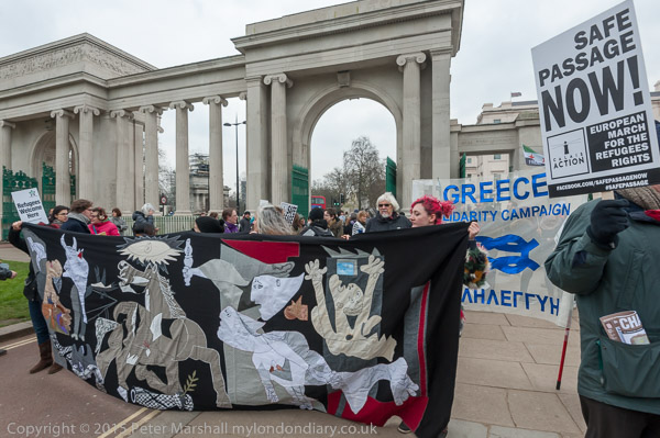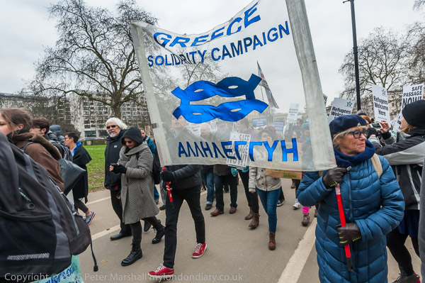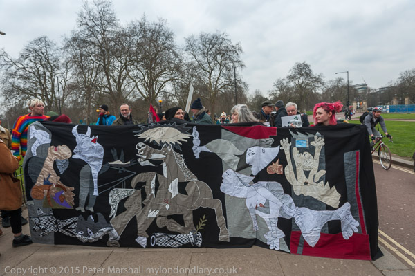 The marchers start to line up at Hyde Park Corner. The Greece Solidarity Campaign banner behind the 'Guernica' banner