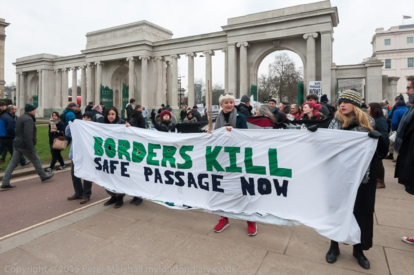 and the main banner at the front 'Borders Kill - Safe Passage Now'