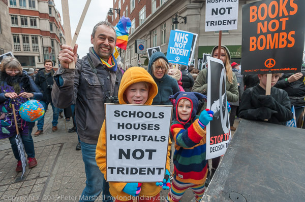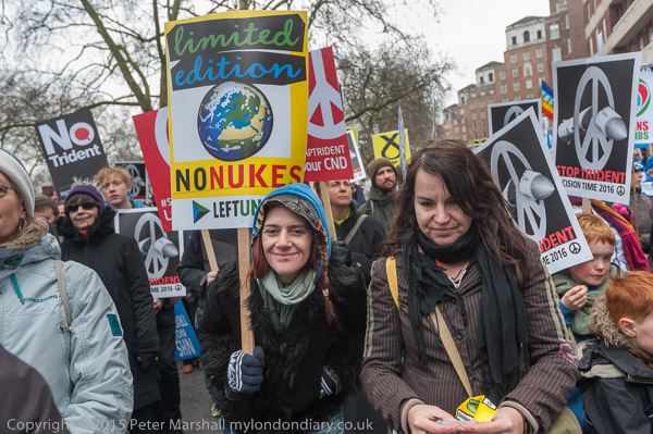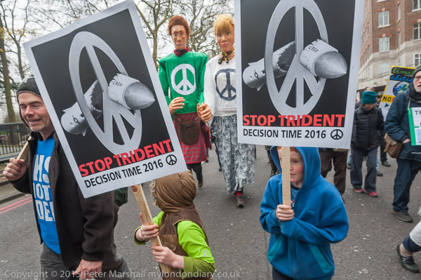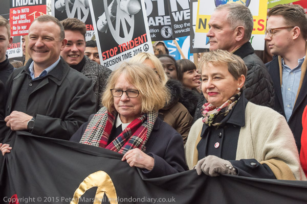 and Green Party MP Caroline Lucas hold the Stop Trident banner