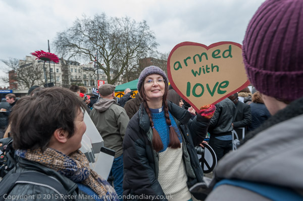 A woman with a clerical collar holds up a heart-shaped poster with the message 'Armed with love'