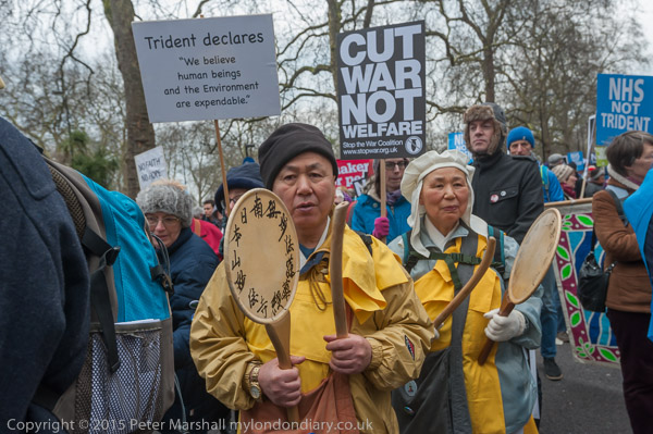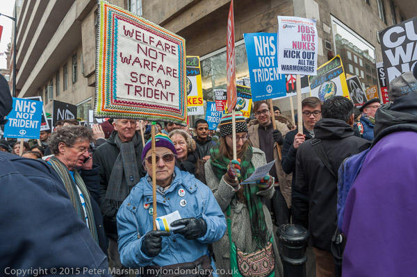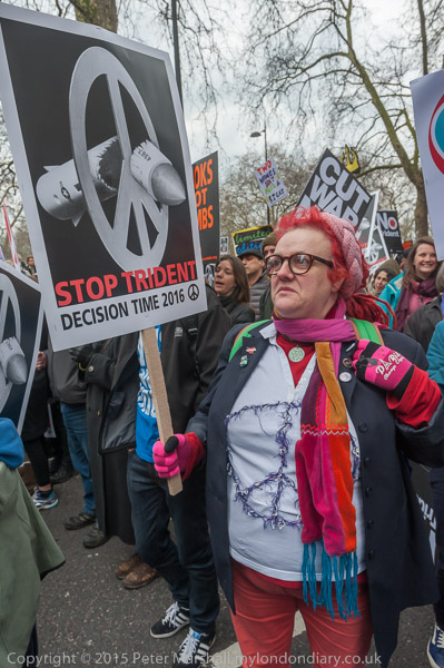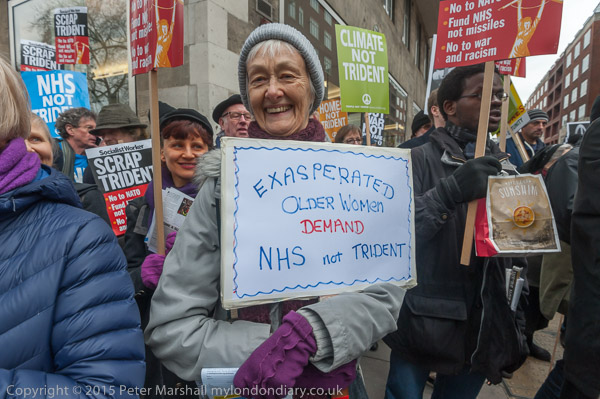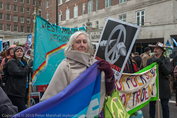 A familiar face with her hand-embrodered placards 'Welfare Not Warefare. Scrap Trident'
