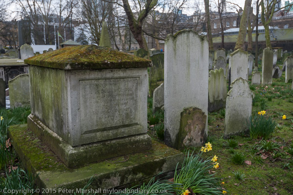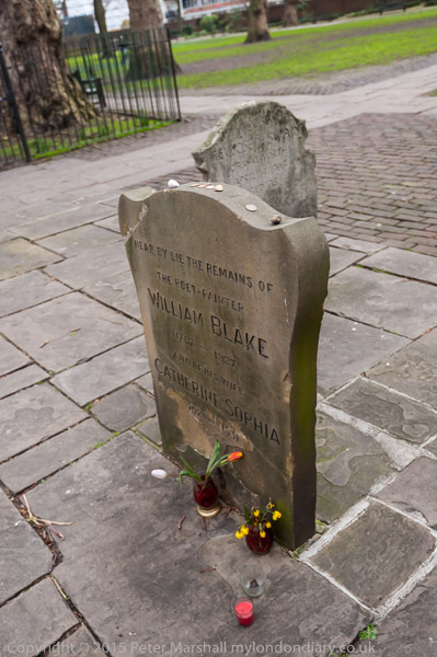 William Blake was buried a little this side of the tree on the far side of the path. His wife on the south side of the cemetery close to Susannah Wesley