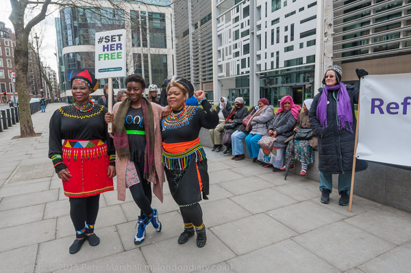 African dancers wait to perform - and a woman gets afriend to take a photograph o f her with them
