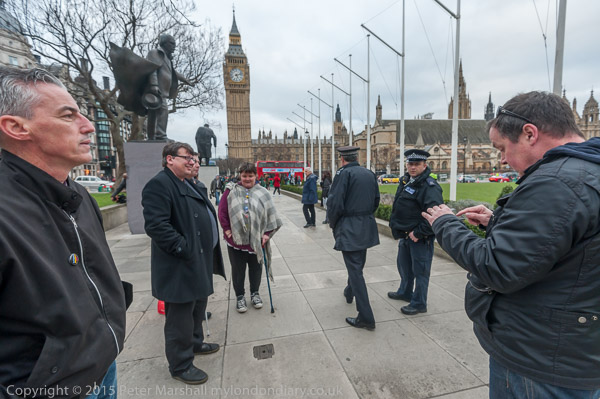 ![]() Police came to ask what the protesters intended to do, but no-one would talk to them ![]() Paula Petersgets out herDPAC banner ![]() 'We demand Rights Not Charity' ![]() ![]() Police watched from a short distance away. There seemed to be far more than the protest warranted ![]() ![]() One of theHeritage Wardens came and joked with the protesters ![]() Paula Peters leads some chanting celebrating IDS's resignation |