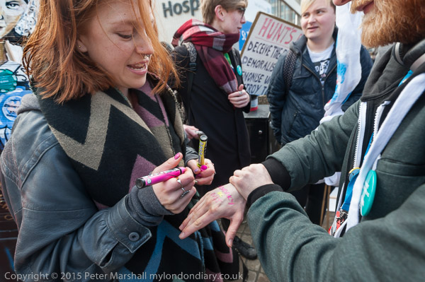 A man gets '#Bursary Or Bust' written on the back of his hand in flourescent red and yellow